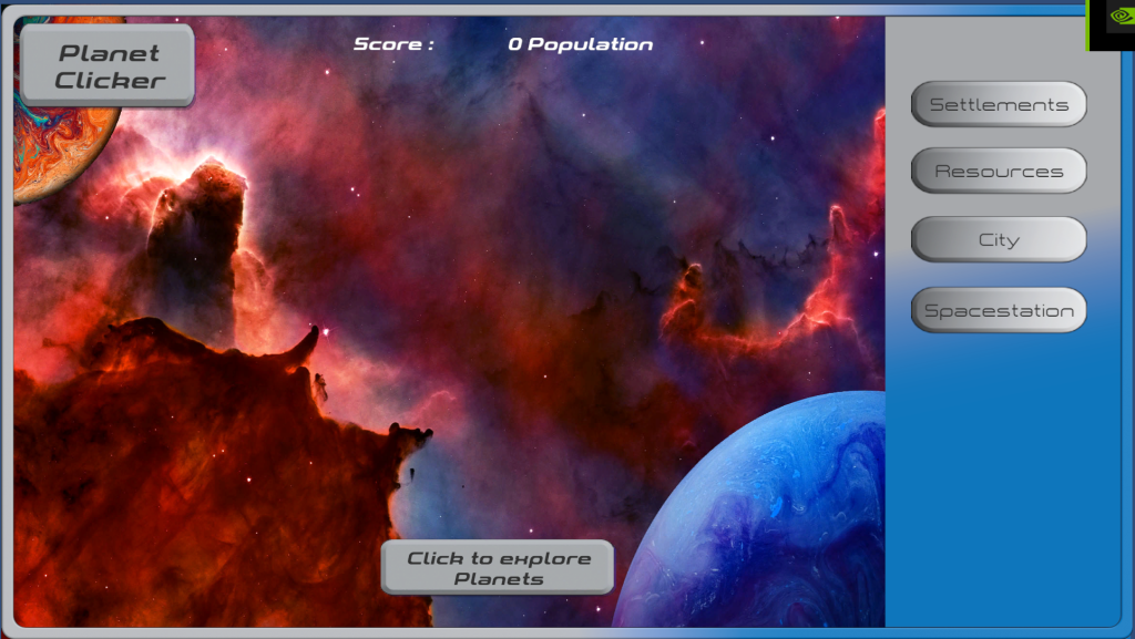 Personally I think that the UI works with my Sci-fi style of the game I created, Whilst it isn’t perfect and I know there are some changes I would like to make most notably the Bottom Button that the player clicks to Increase their population (score). I had created a planet button so the player would click on a planet but when I added this into Unity, The button no longer worked as intended so I had to drop it from the final desing.