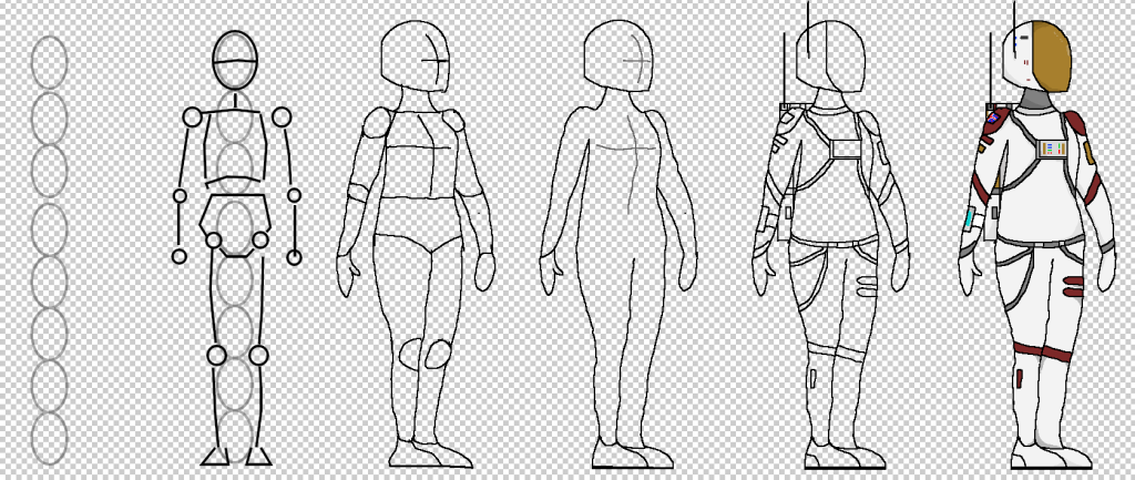 I started with a basic design and template using the 8 head rule to give a general basis of my character. I then slowly moved from the basic connected shapes to adding detail and finally adding colour.