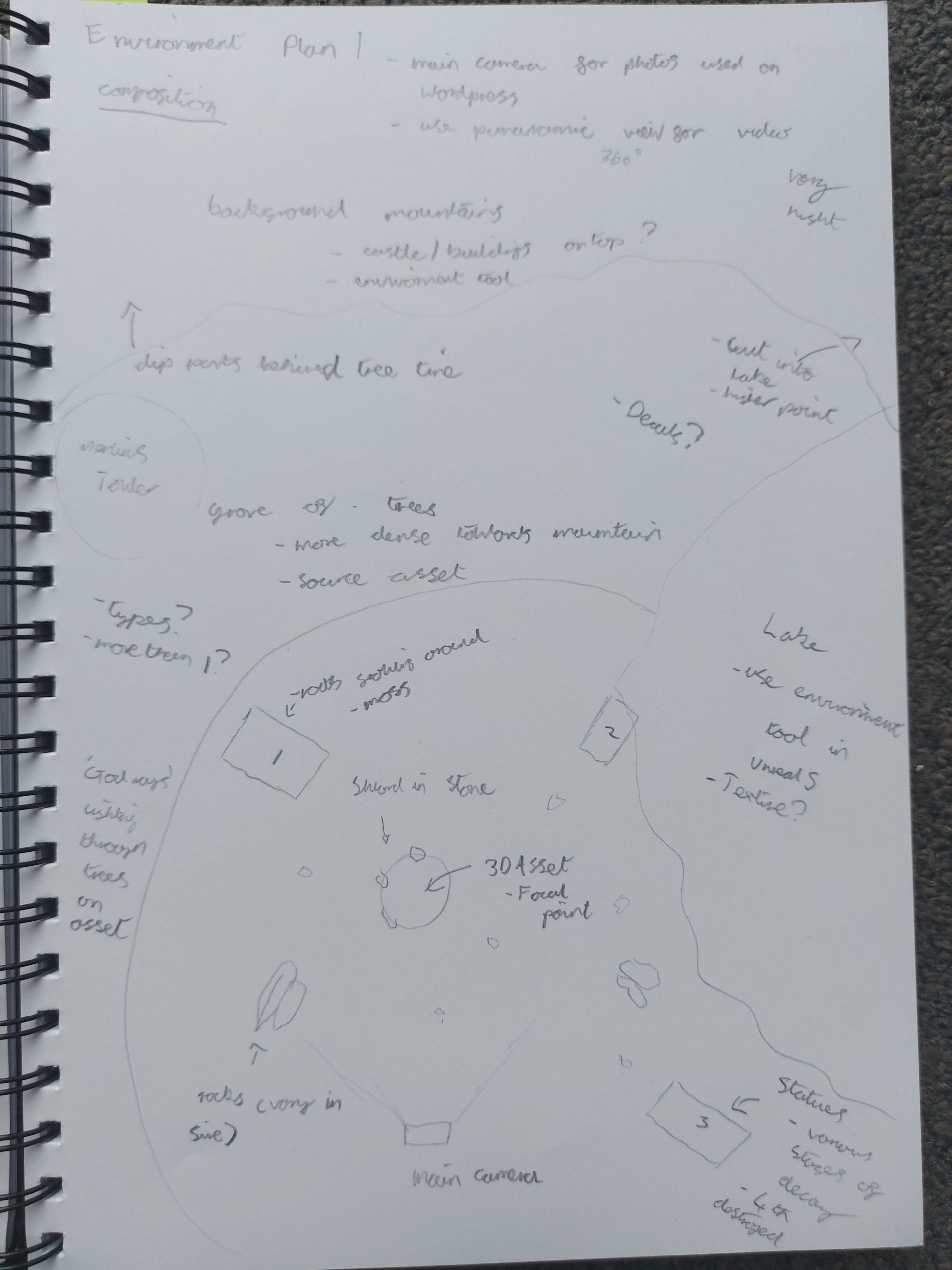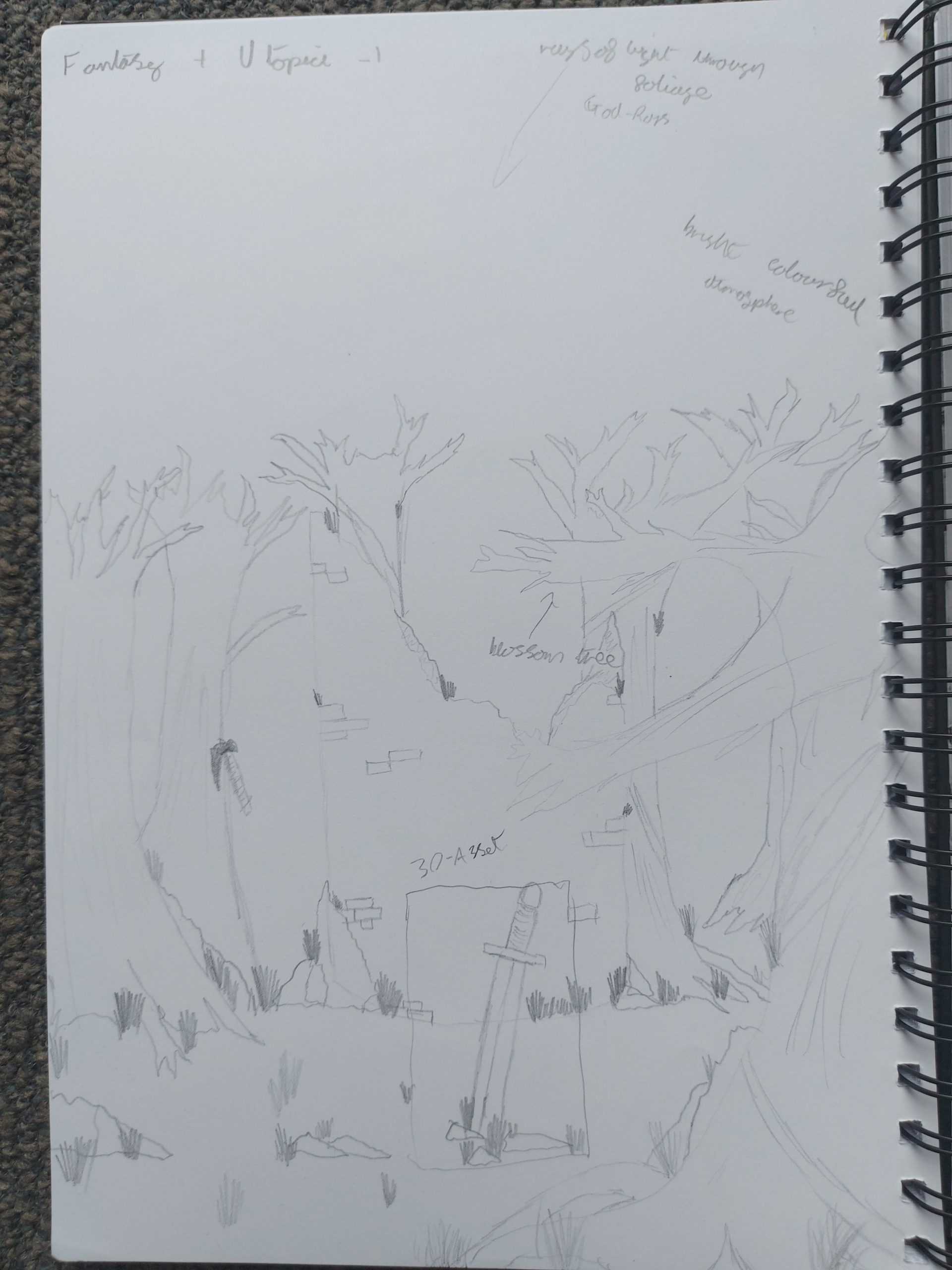 In order to get some basic ideas as to how I could layout my environment for each theme as well as what asset I might create I sketched 4 basic concepts for the group themes I created Previously;