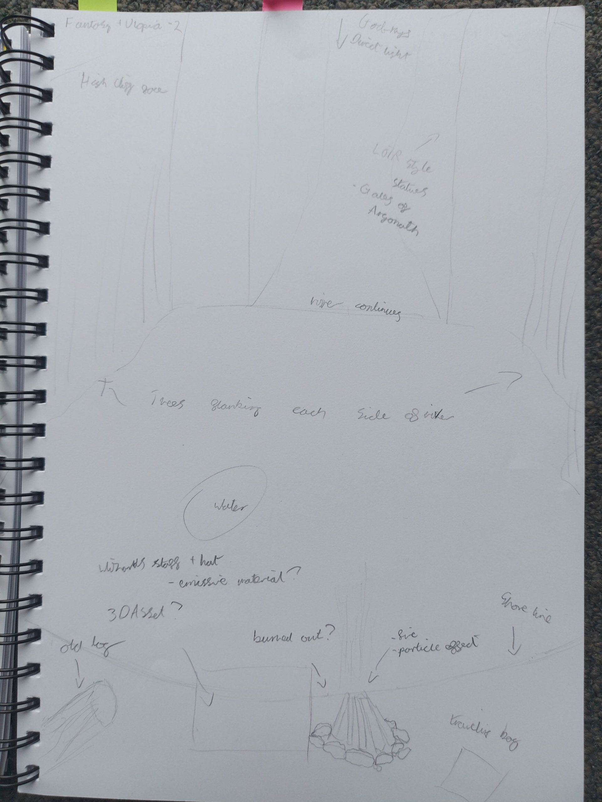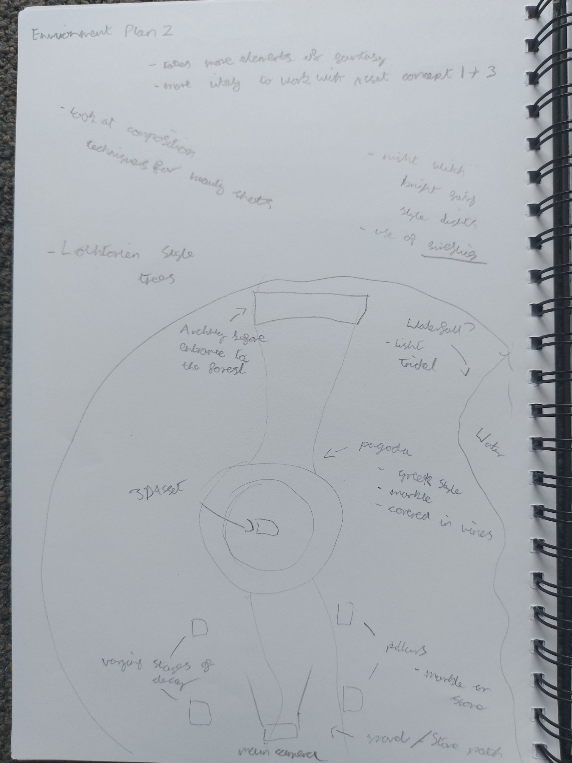With Some basic ideas in mind I wanted to sketch together some basic concepts so I could get a feel of what each of my 4 chosen themes might look like. I mainly focused on the 3D asset that I would create to go in my environment but I still created some generic scenes and some top down environment ideas as to how I could layout my scene