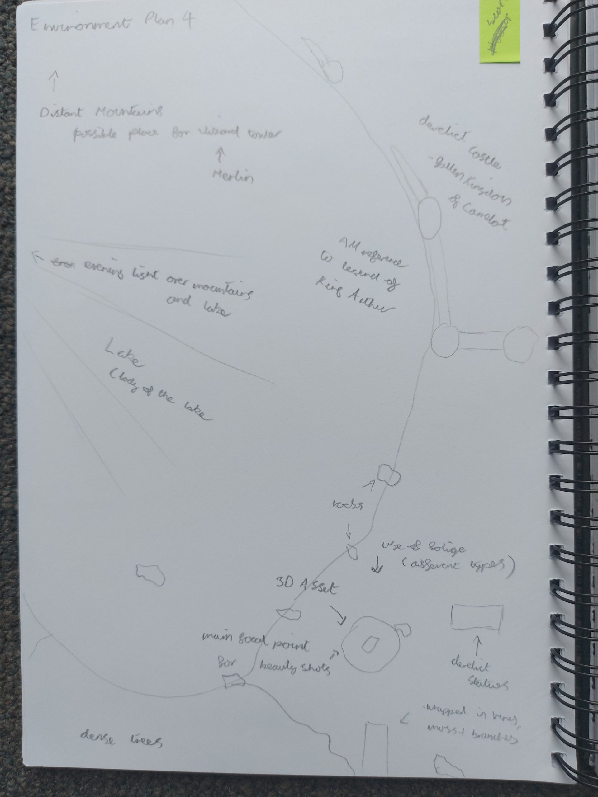 With my asset being a sword I wanted to draw some inspiration from the legend of the sword in the stone and King Arthur, so for my first concepts I wanted to include as much reference to these legends as I could. So I looked at include the sword in the stone as a central point to the whole scene surrounded by a magical forest, with a lake on one side and a derelict Wizards tower on the other.