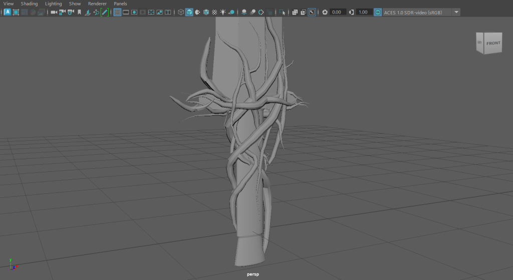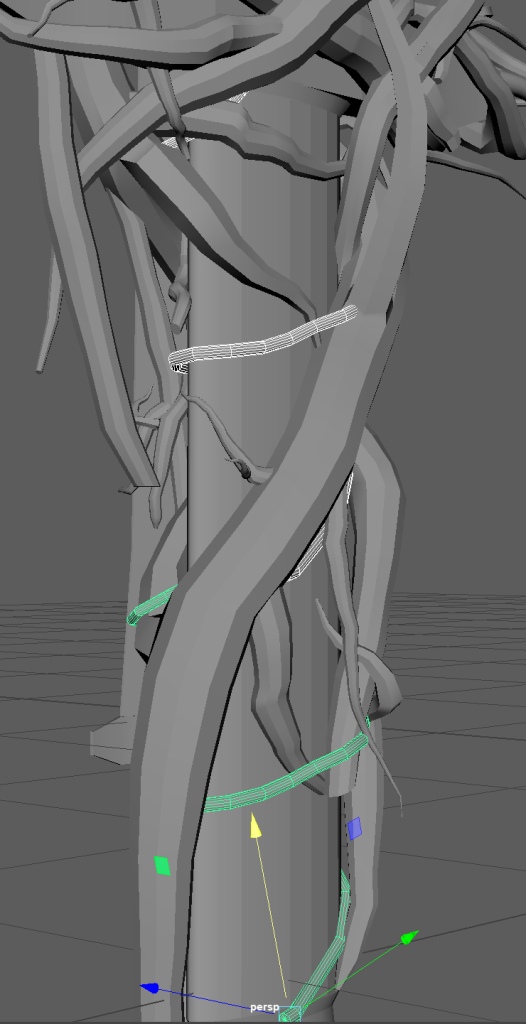To create the branches I had to learn a process and use tools I wasn’t familiar with, by creating a CV curve and adding multiple points that I could manipulate. I could extrude a cylinder along these points and add divisions to make a low poly branch.