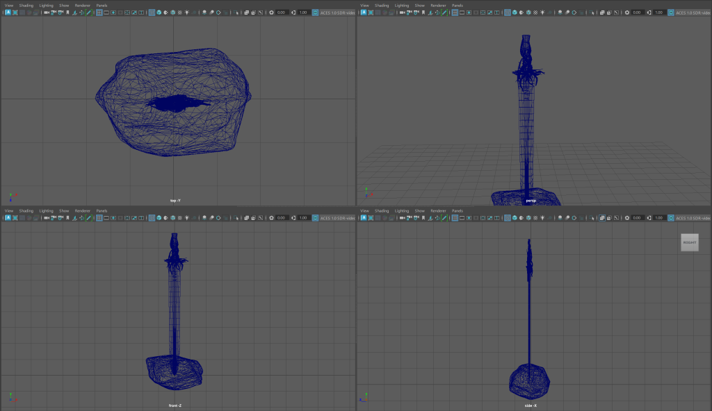 I Started to model a rock which the sword will be slotted into to create ‘the sword in the stone’ aesthetic I want to create. Using a Platonic Solid (tetrahedron) and adding divisions, I used the soft select tool to soften and edit some the edges before I topologized the shape to make the edges more even and add some form and roundness to the stone
