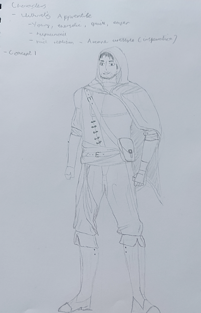 I still wanted a young character, that is energetic, eager and able to make use of the environment and its properties to craft potions and ailments. Within the design I gave them a satchel attached to their belt where they will be able to hold these plants and herbs. I also incorporated the runes into their clothing more as a design element that shows they are of a wizarding order, I think it would be quite nice and visually appealing if the runes light up or glow whenever they are casting a spell, highlighting that what they are wearing is imbued with magical properties.