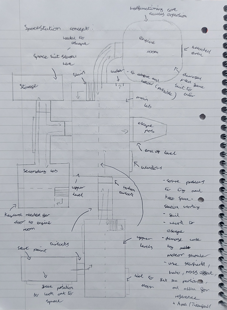 For my second concept I wanted to create a small space station where the players objective is to complete several tasks to stop the station shutting down after an asteroid shower hit. Parts of the station can be in lockdown forcing the player to find keys to open airlocks or corridors could fall apart in front of the player to block their path. In the end the objectives they complete are useless as the reactor fails meaning the player must flee to reach an escape pod as the station starts to rapidly falling apart.