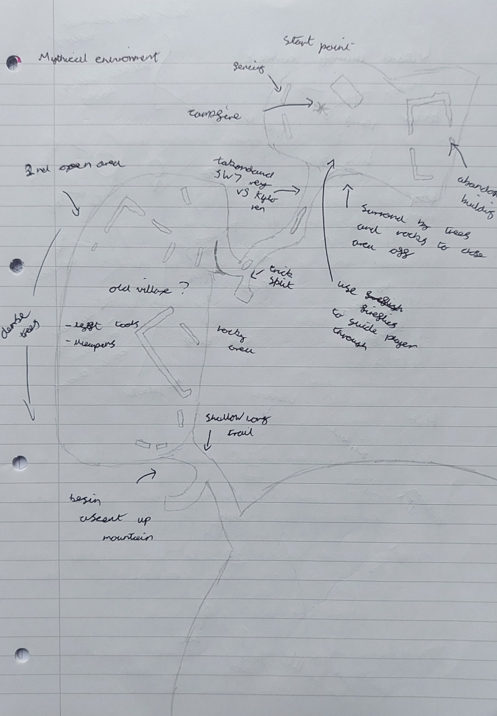 I took inspiration from the opening of Rise of the Tomb Raider (2015) where the player takes control of Lara Croft as she ascends a snowy mountain. With this concept I would like to use the landscape and environment to challenge the player as they try to reach the top of the mountain.