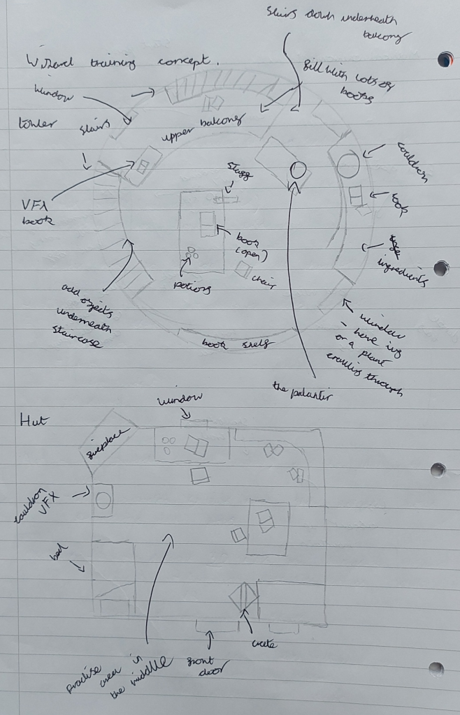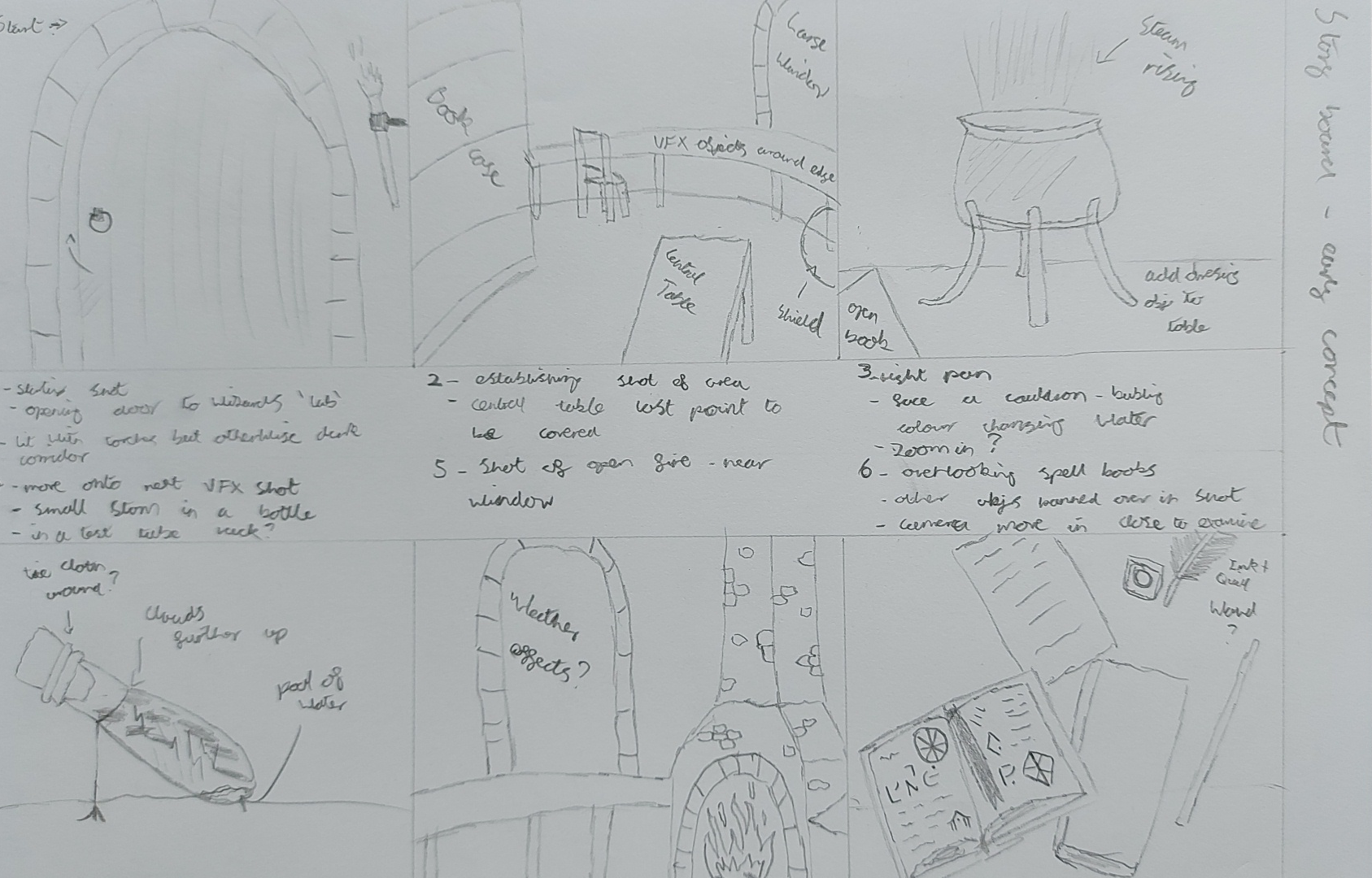 The camera will navigate around the room focusing on different spells, potions and other effects before turning to look at a wizard staff and open book that begin pulsating with magic as the player approaches before the scene ends. I started to gather some reference images on Pinterest as well as create a simple storyboard to concept the idea together and see how it would play out.