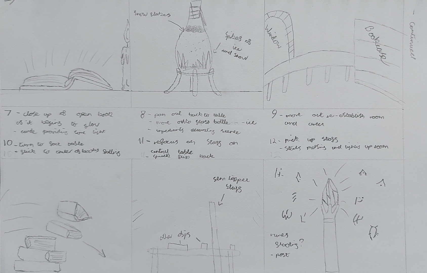 - Shot 6 – Wizard’s book part 1: Pan from previous scene to focus onto table. slow pan across table to open book. focus in on page. 4 seconds max duration.