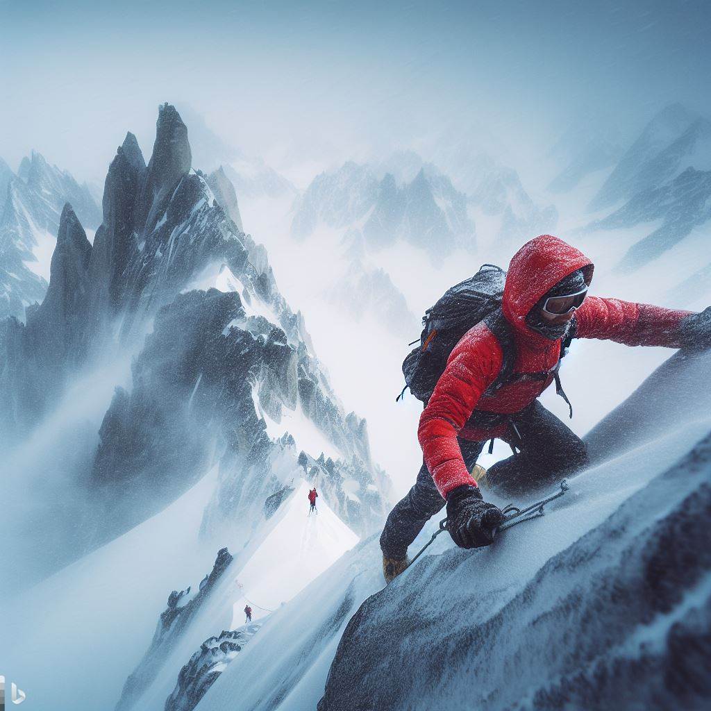 Bing Chat GPT4 (2023) A climber In a Blizzard with mountains in the background [AI Generated Image] prompted by Alexander Rushton. 31st October 2023. 13:12