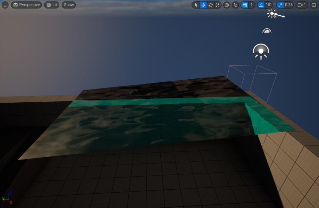 Water is something that I wanted to look at for the level design environment as well as, being something I would like to incorporate into the design of the game cutscene. This was mainly created by a material being applied to a plane to create some slight ripples and a change of colour in depth