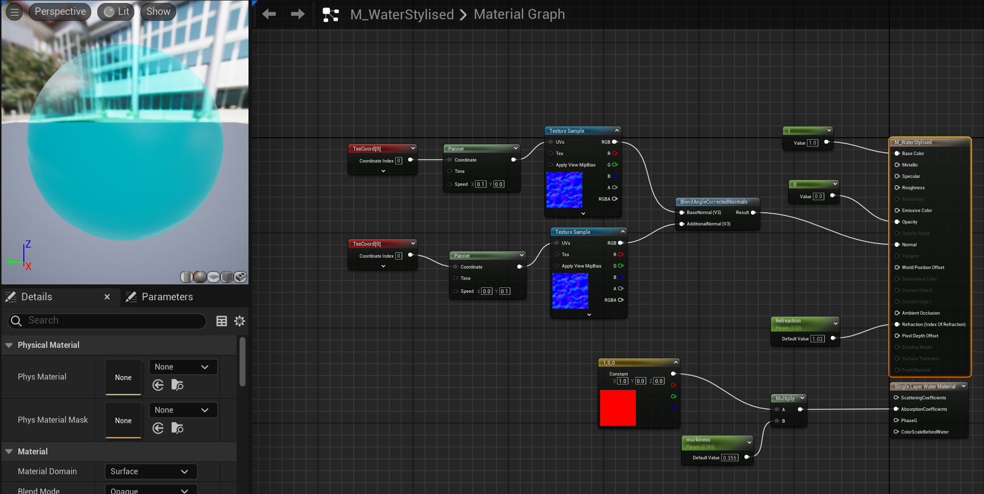 There is a pre-set for creating water as a material in Unreal by setting the main node to surface, opaque and single layer water. it adds a new node that is used to create realistic water.