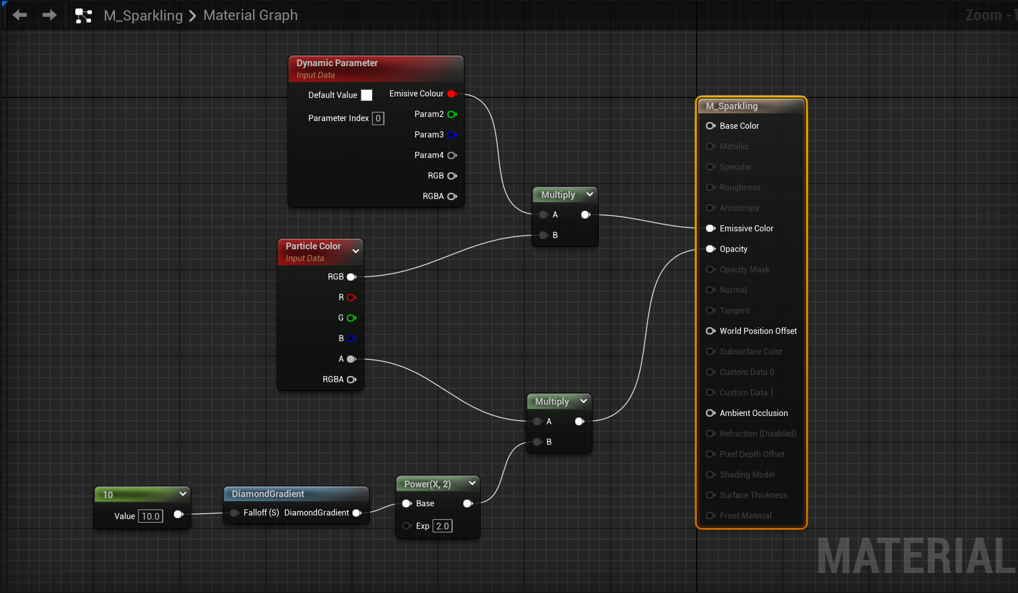 I started with a material instance that will allow me to set the colour of the particles so that they change over a duration of time as well as set the particles to a diamond shape.