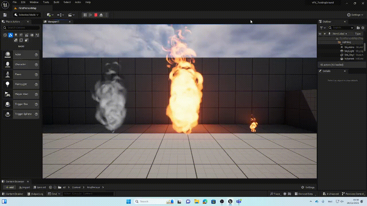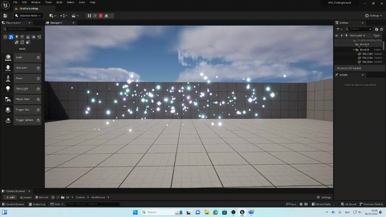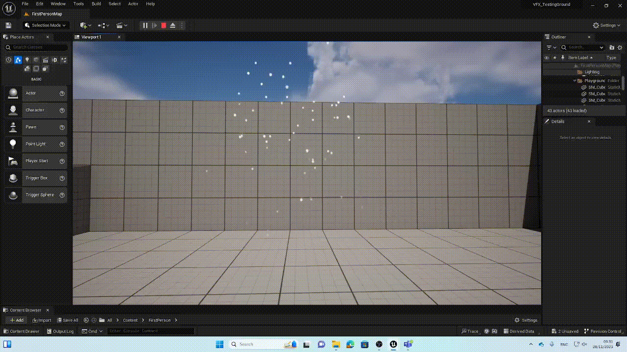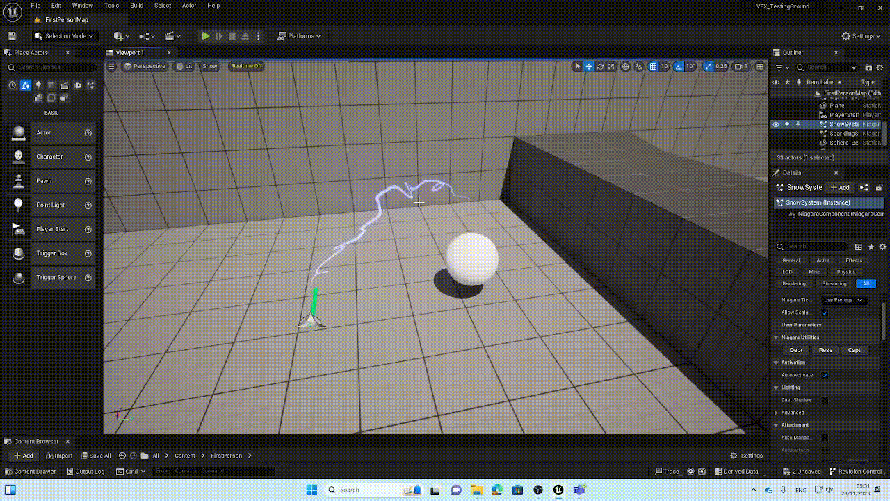 For the remaining visual effects I can use the Niagara particle system, Unreal’s material system and blueprints to create the desired affects I want in my scene.