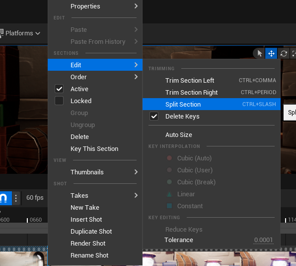 Then by selecting my main shot and using edit when I left clicked. I split the main shot up at the points where my close ups are (frames 700, 1050 and 1300 – these where keyframed in the main sequence so that I could use those values when combining the shots together).