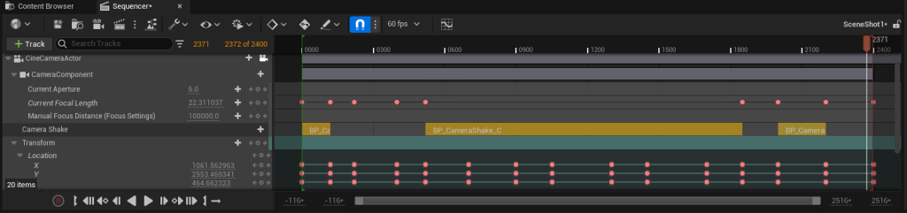 With that created I added it to the main sequence by clicking the plus icon on the camera, adding camera shake and selecting my created blueprint. From here I tested the values and changed them by either scaling them up or down depending on my preference.