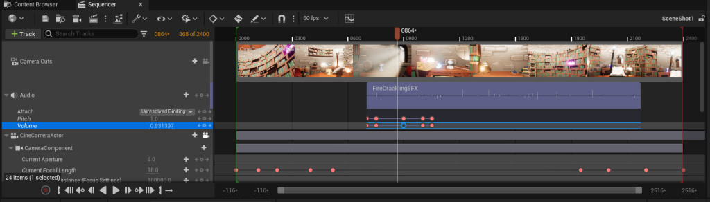 I had a look at the Unreal Engine documentation to see how I could implement raw audio files into my sequence and set them up using key frames to play at different times. This way I will be able to fade out sounds when the camera pans away.