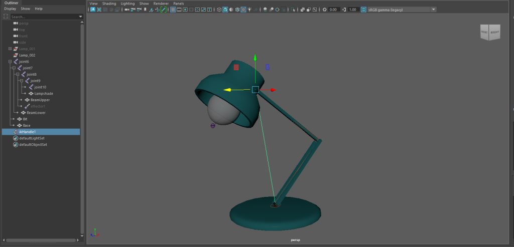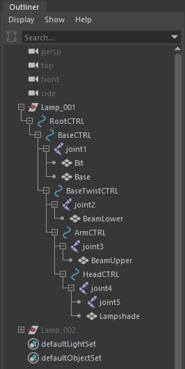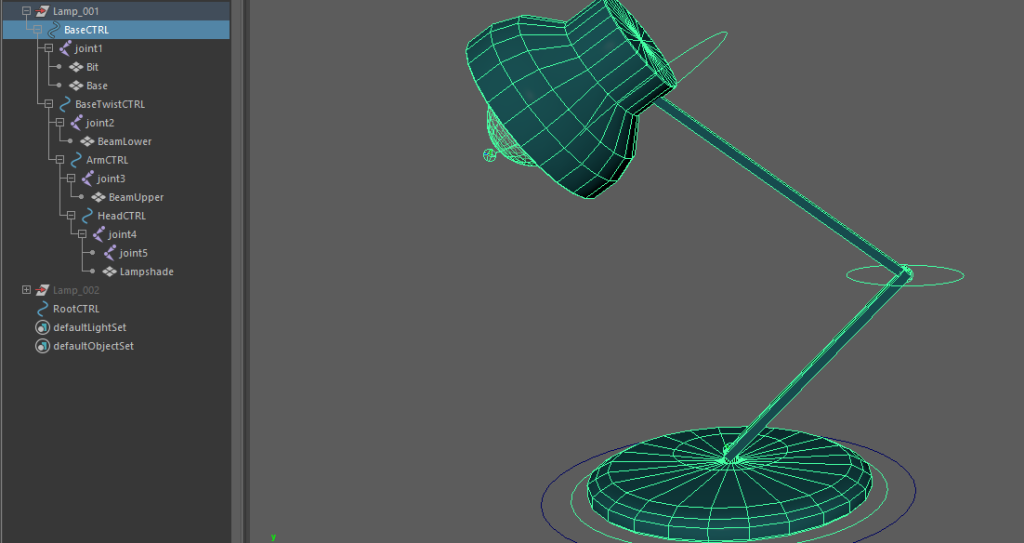 With the joints in place I could move onto connecting them to the mesh and adding in some curves as controllers to control the movement of the lamp mesh.