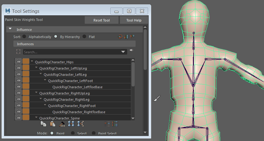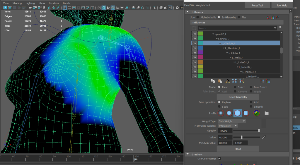 I then mirrored the influence over and used the smooth point operator to smooth any edges or discrepancies each joint had after being mirrored to the other side of the mesh.