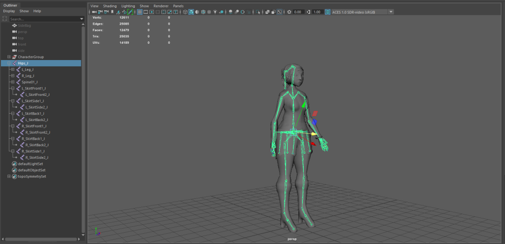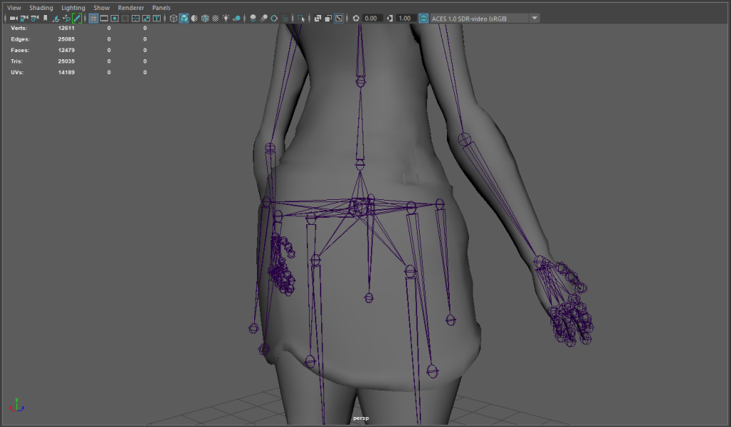 I then worked on the legs and skirt. I started by moving the controls to an extreme movement point by moving the joint controls. For the skirt this tended to be up and away from the body and, for the legs I had the character almost crouching. This allowed me to get a good idea as to where the mesh was deforming and what parts need more or less influence being added or removed.