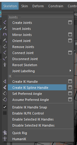 The bones are created using the rigging submenu, from there I can begin to add bones in the main areas of movement. These bones will control the translation of the mesh when animating. I can later add some curves to create some controllers that will be used to move each of the bones and for key framing.