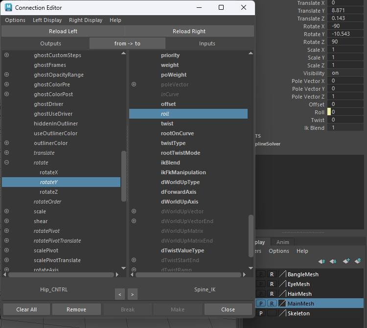 The spline IK has some extra things we can manipulate with the connection editor, by adding roll to the Y rotate of the hip control and twist to the Y rotate of the shoulder control it creates adds more movement options and control when animating.