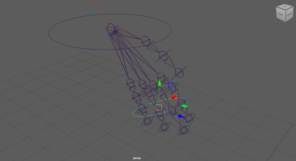 I did originally test an idea where I would have a control for all of the joints (image below). I did realise that this wouldn’t work as I wouldn’t get the individual joint movement I wanted. From here I looked into adding driven keys.