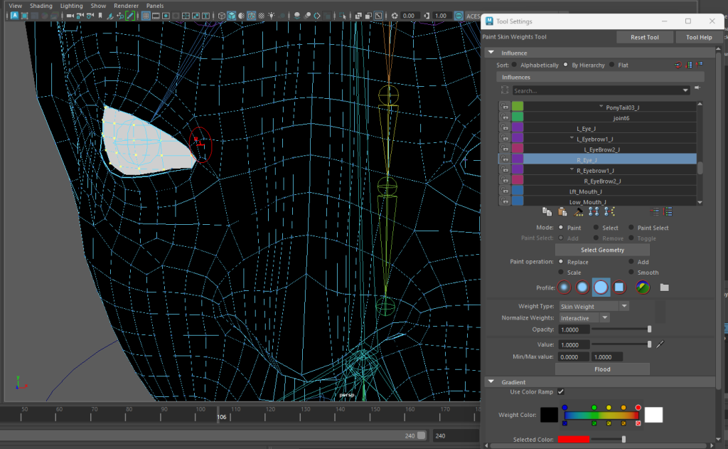 I then looked at the eyes using the vertex select tool to highlight the whole eye and flood it with a influence of 1 for each eye joint. This means that only those joints will have influence over the whole eye shape.