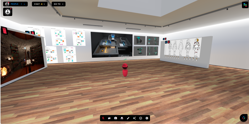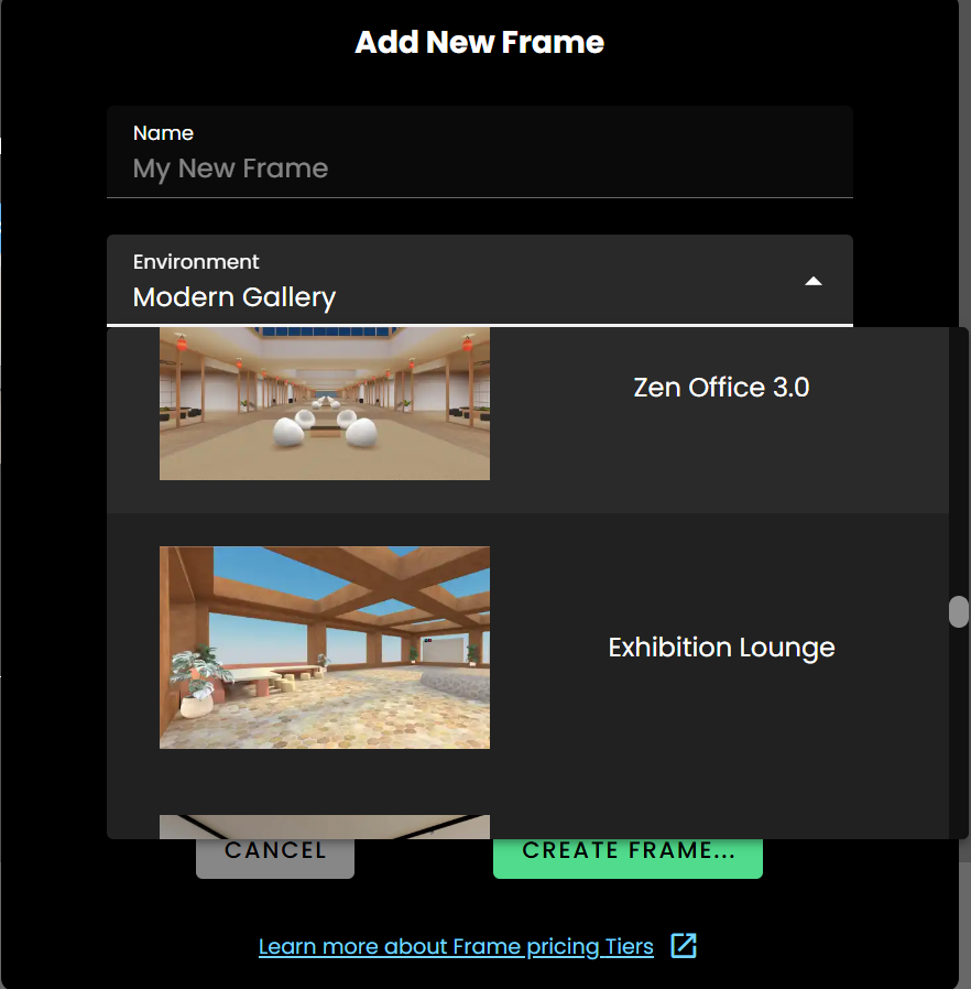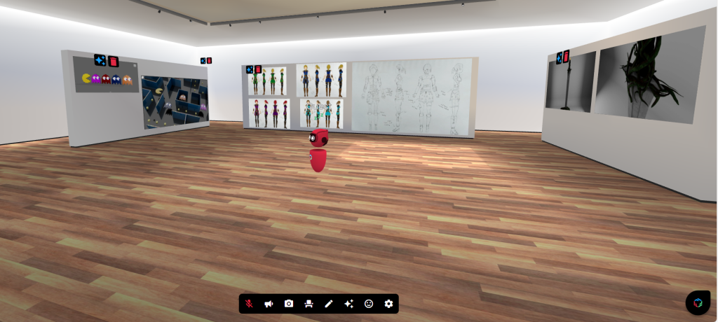 Frame VR or WebXR is an interactive 3D environment area with a large range of pre-set environments. These range from gallery spaces, classrooms, office spaces and resorts. These environments don’t require any coding knowledge to set up and can be created on the web via a computer or VR headset.