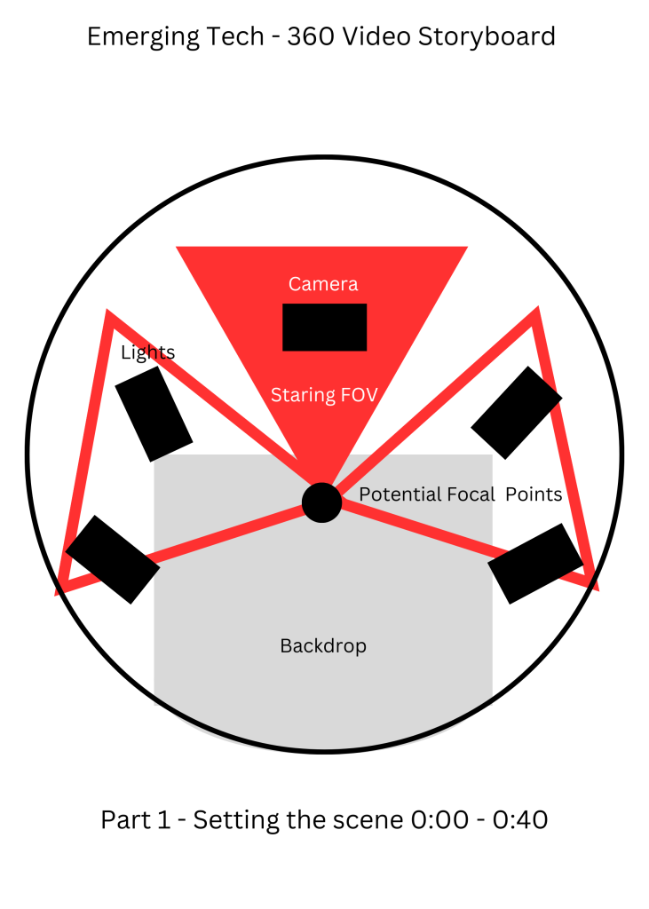 - POV and directing the user – The player will be the main focus of the experience. They are there to act as a model of sorts within the experience, as the ‘camera’ is in front of them. To help set this narrative the player will enter the experience facing the camera, with the backdrop behind them. I can add in a voice over to tell then player what to expect. I can also have the studio start in a ‘neutral’ position (overhead lights on to light the whole area) so they player isn’t overwhelmed as they enter.