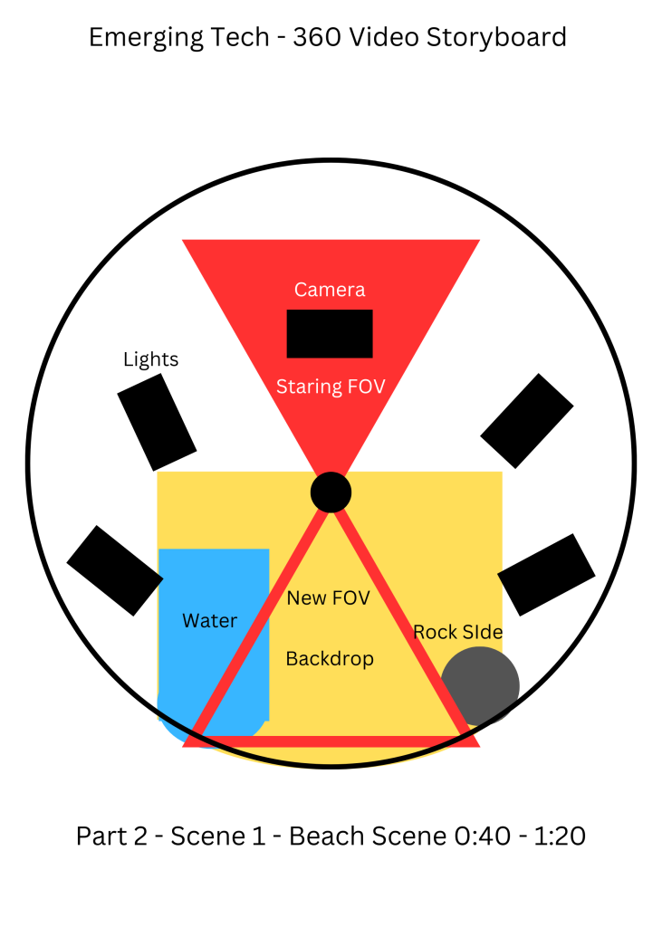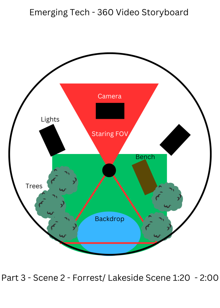 I mocked up some quick storyboards to show how I would layout the scene and the main focal points that the user will be looking at each time frame. The Idea is to have the user turn around and experience the change in scenery, before facing the camera again.