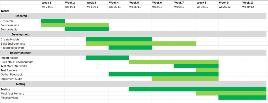The development of the project as a whole relies on myself completing each parts of the project before moving onto the next in a waterfall. There are some areas of development that I can complete in tandem like importing assets and building the environment. But that still requires me to sourced all of the assets and have completed my research.